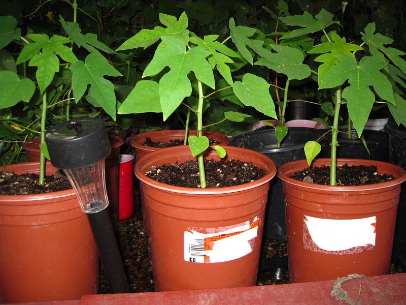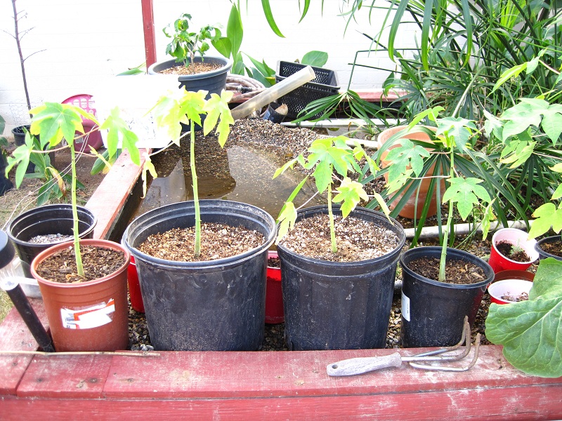 The papayas haven't done much over the last two months the trunk has gotten bigger but not much height growth. Re-potted two of them in a much looser potting mix hopefully this will keep them from getting root rot over the winter.