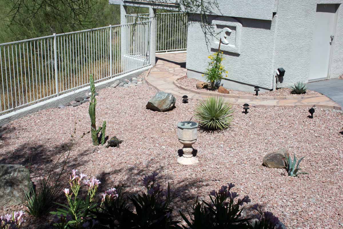 | Thank you for noticing, so do I! If you look at the previous pic, you'll see that I moved a lamp to make room for it. There's room for another plant or two in the back toward the fence, but I have no idea what. I wouldn't mind another Fire Bush there, but I'm thinking of reducing the drip system in the yard to two hours once per week to better accommodate the Yucca (1), Cacti (2), and Agaves (5), and a Fire Bush is too thirsty for that. I'm not sure how my Tecomas (capensis x 2 + stans) will react, but I'm willing to double up on emitters and find out. The Cape Honeysuckle's are large and well-established, but the Yellow Bells is just a pup. It will have several months to settle in, so it may be OK. If they do not go along with the program, I'll have to abandon the idea. As it is, I'll need to supplement by hand-watering my Asparagus, Sansevieria, and Strelitzia once or twice per week, but they're all in one spot, so that's not a problem.