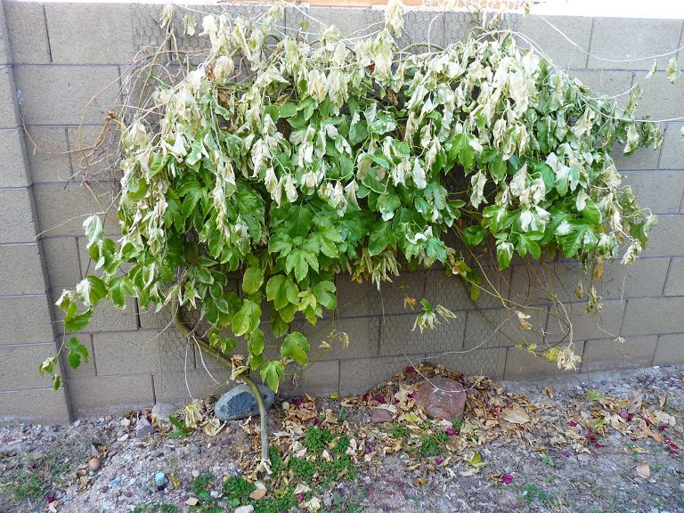 These purple passion fruit were not protected and took some damage on the top. The bottom and the main stems look good though, so I can't complain. This one recovered from being frozen to the ground in 2007.