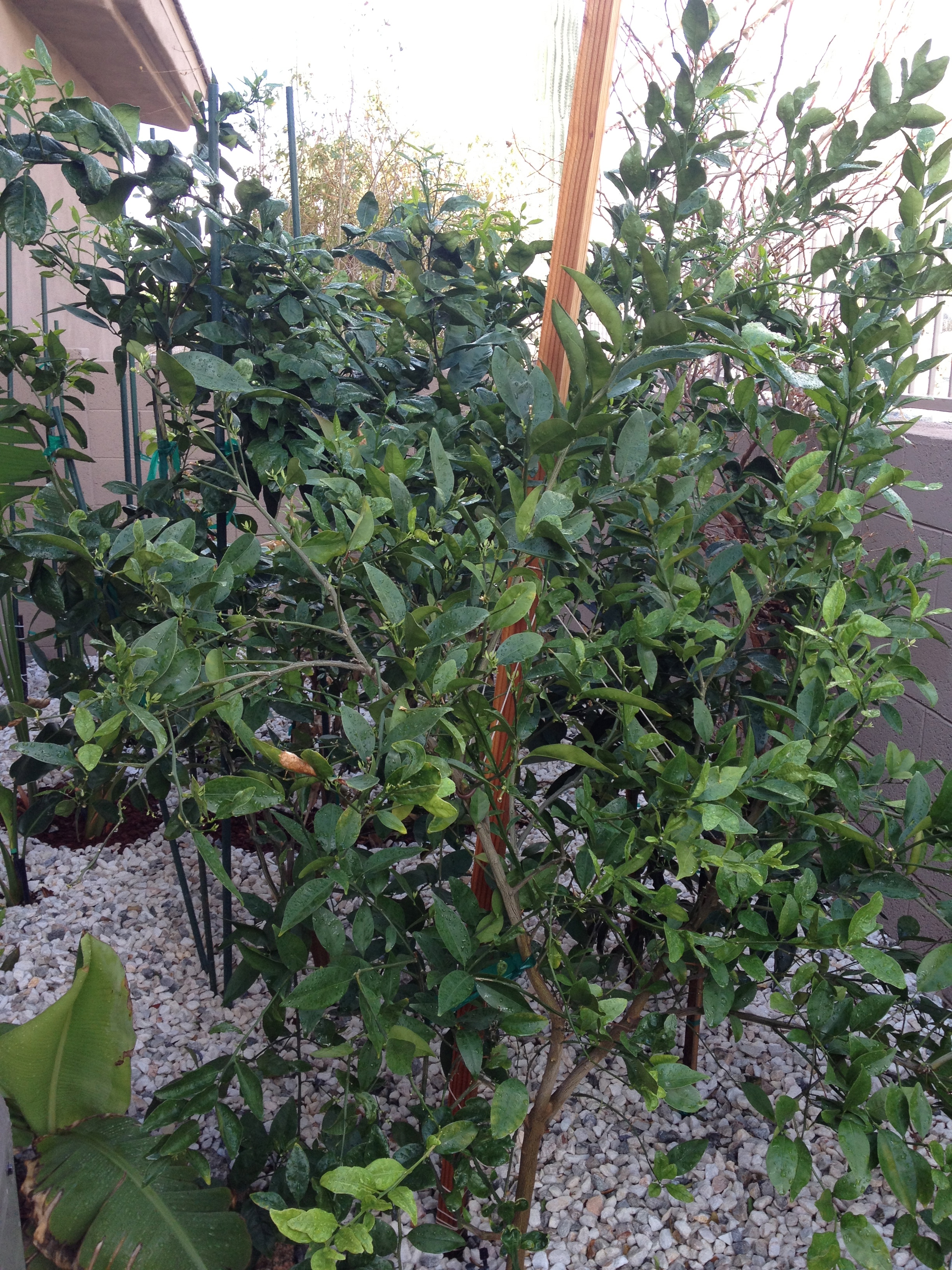 As far as planting, the ground is dug out everywhere there is white rock. Is is 18 inches deep by the wall and about three feet deep in the middle. Digging this out was a massive undertaking back in 2007. The soil is half native soil and half palm-cactus mix. The native soil was sifted to remove any rocks larger than a small pebble. I only fertilize the citrus, pomegranates, bananas, and a cocktail plum tree. Everything but the bananas receives basic Miracle Grow. The bananas get Miracid (30-10-10).