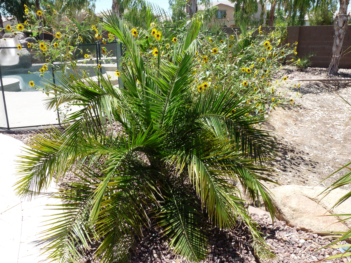 Here is a picture of one of my Phoenix Rupicola x Reclinata. This palm was purchased as a 15g from Treeland 3 years ago. The palm has easily tripled in size in that time. A nice feature are the leaves which are soft meaning it won't gore you when you pass by. A good full-sun palm for use near a walkway or pool perhaps. Cold tolerance is similar to a Pygmy date in my experience. The leaves will bronze below 27F perhaps.
