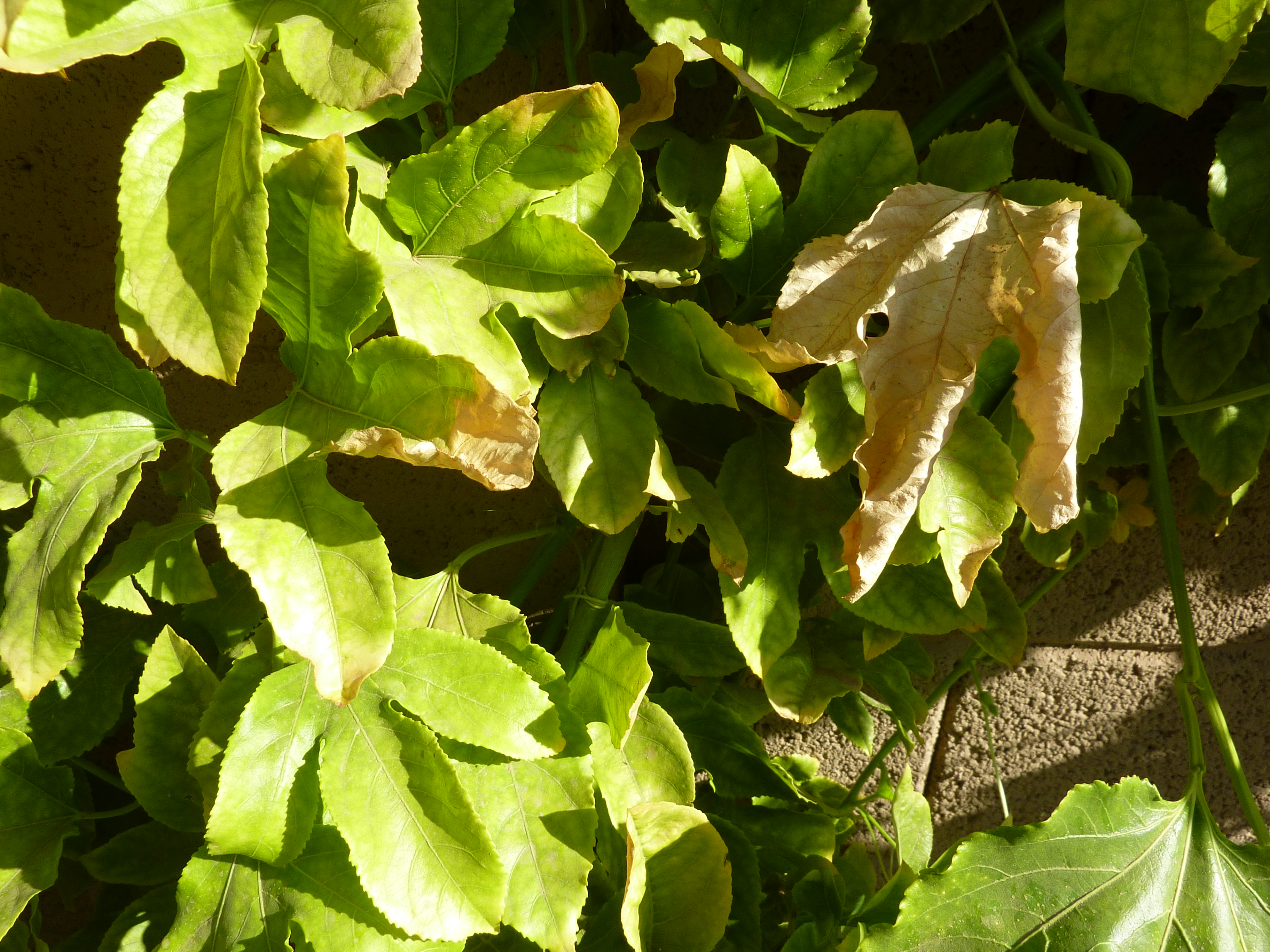 Also, the paleness you see is partly caused by the heat, but could also be lack of nitrogen. Try some fish emulsion 5-1-1. Passionfruit can also handle stronger chemical fertilizers but you need to be extra conservative with it when its really hot out.
