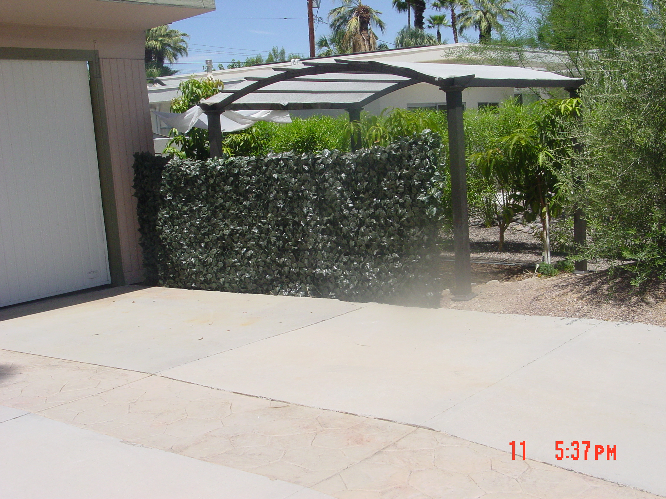 (A fake ivy blockade and a pergola (from a kit) topped with 22% shade cloth.