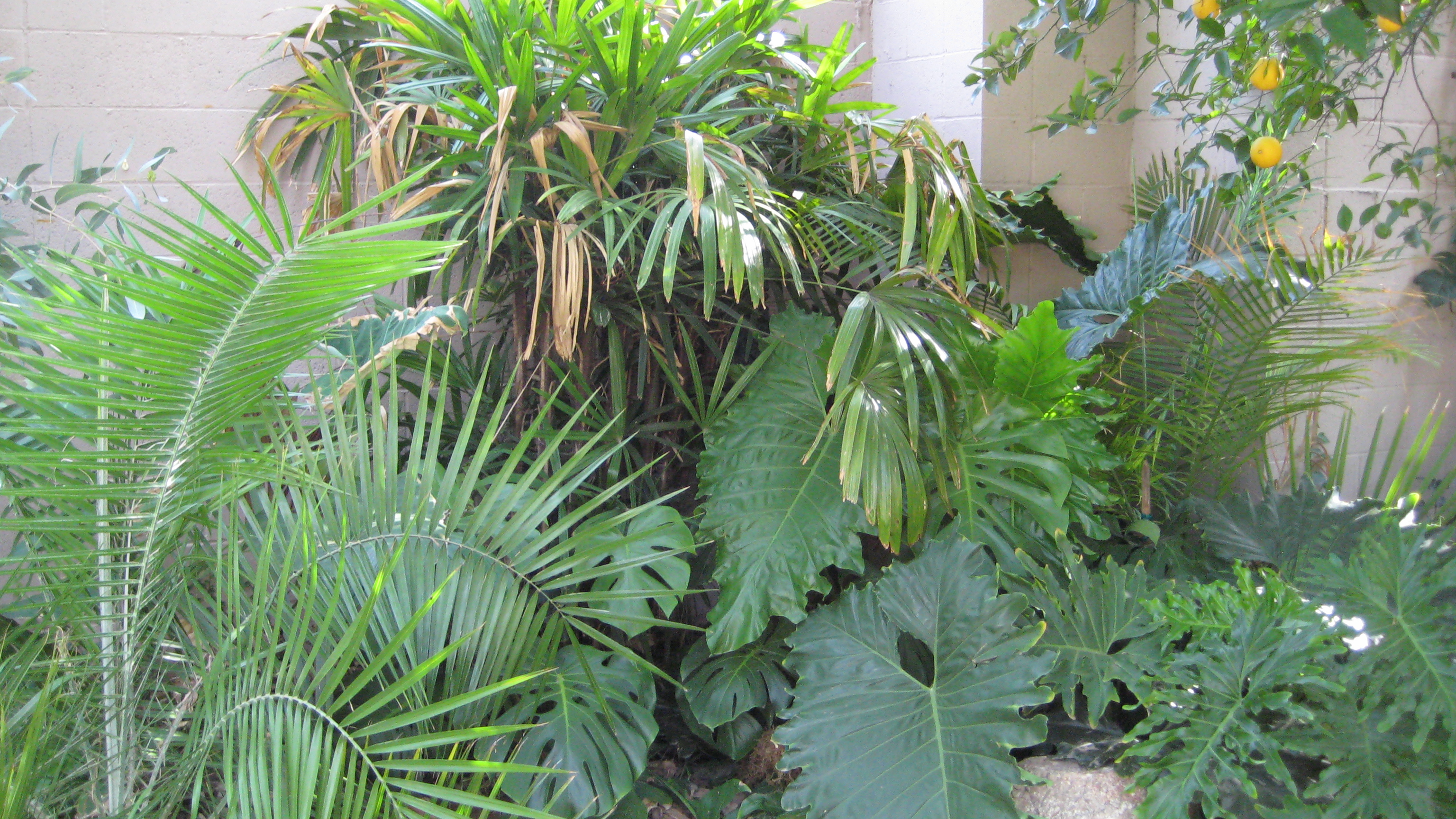 rhapis, and various other plants that have created a bit of a microclimate in this corner