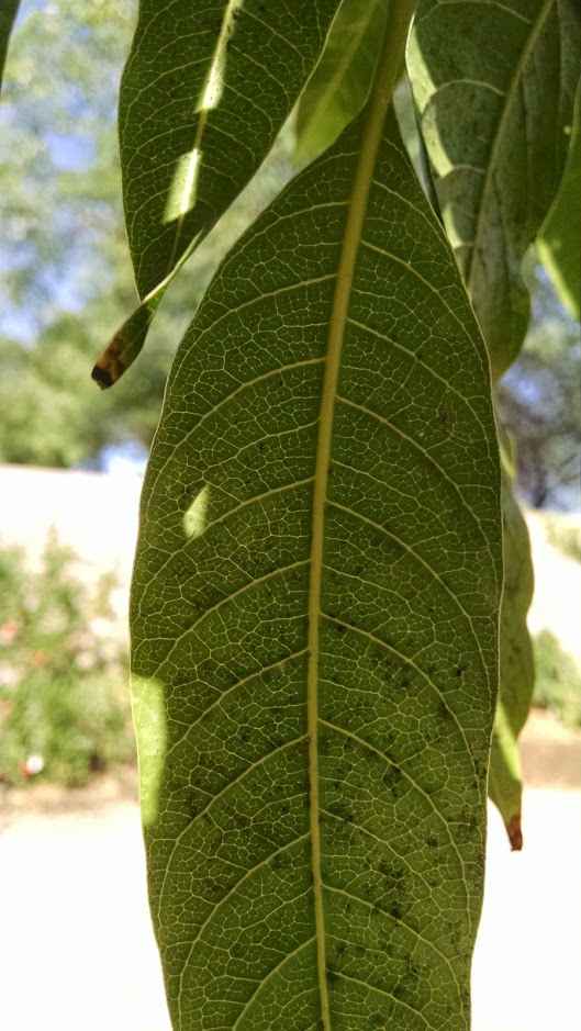 I think what this fungal infection could be is black spot fungus. The reason I didn't find it before is that I was searching for mango infections, and this is fungus more commonly affects roses.